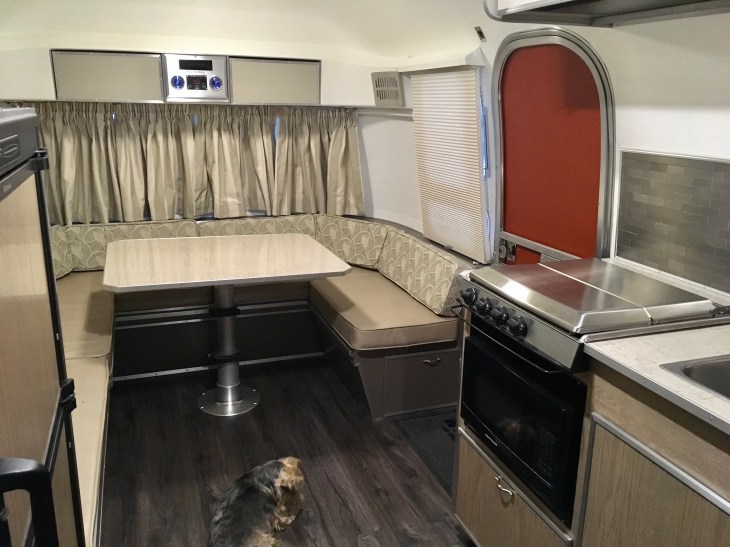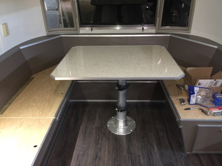 The dinette at the front of the Airstream. The tabletop is on a telescoping pedestal that will allow it to be lowered onto the cleats on the sides. The back seat cushions will fill in to provide a queen sized bed. The cushions are done and waiting inside the house.