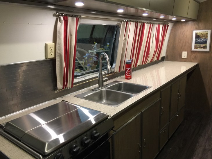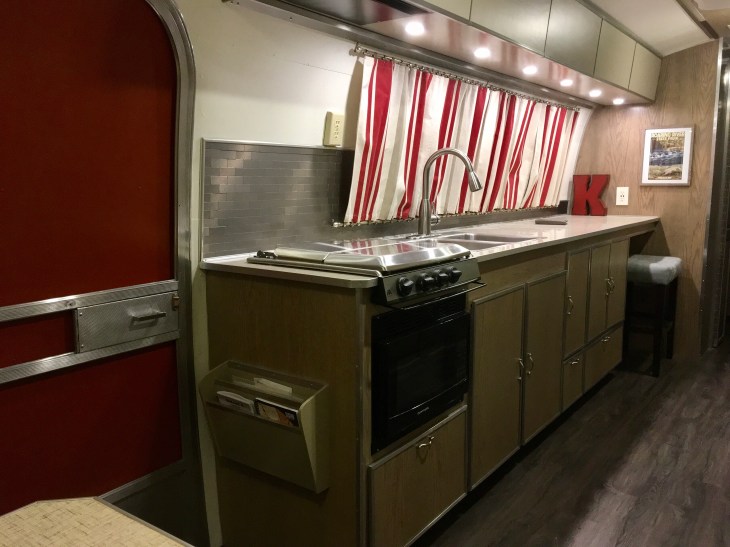 This is the kitchen! All 10 feet of it. Everything has been constructed with the ‘ounces make pounds’ thought process. Vintage Airstreams (ours is a 1969 Overlander) were designed and constructed to be pulled by the family car. We think it is important to maintain that original design structure.